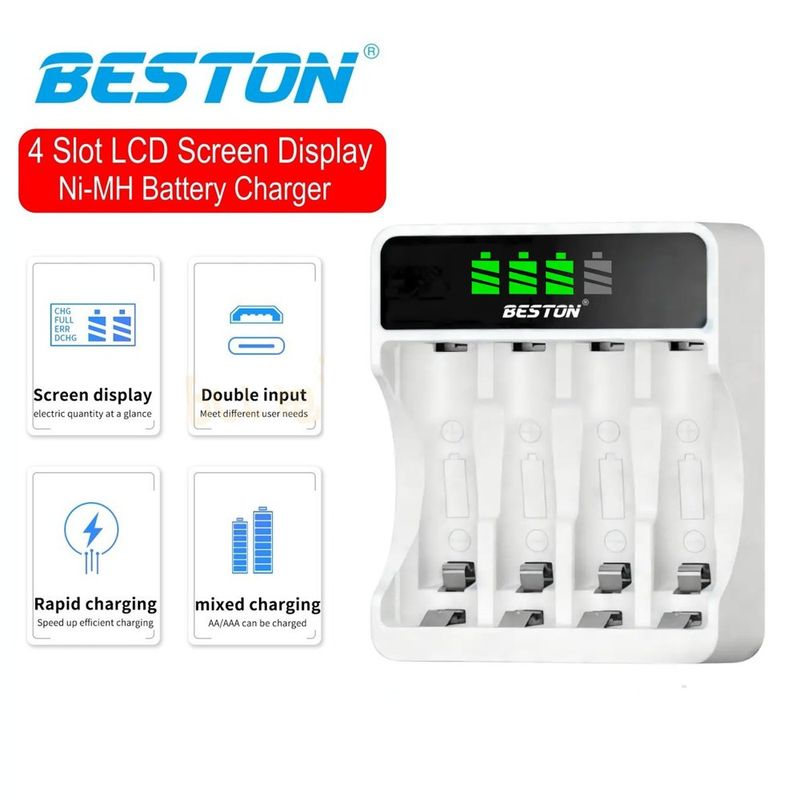 Construccion y herramientasElectricidadLinternas, Pilas y BateríasKit Cargador Inteligente de Pilas con Pantalla LCD 4 puestos + 4 pilas AA Ni-MH