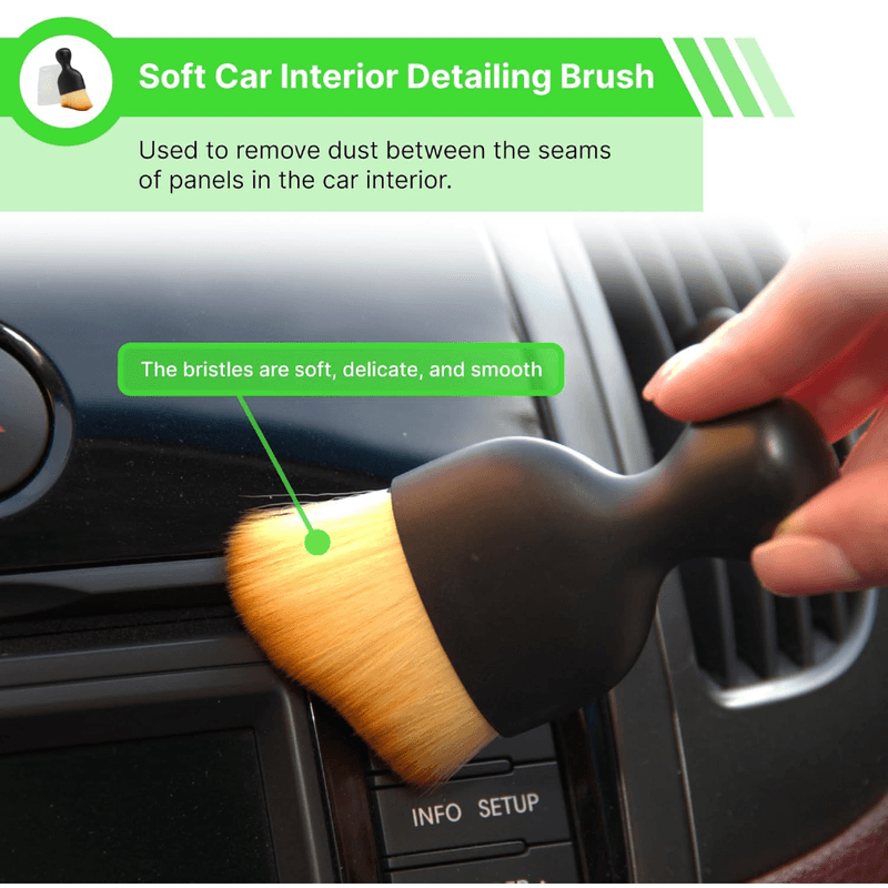 El cepillo interior de cerdas suaves llega profundamente entre los paneles del tablero y las rejillas de ventilación para eliminar el polvo persistente.
