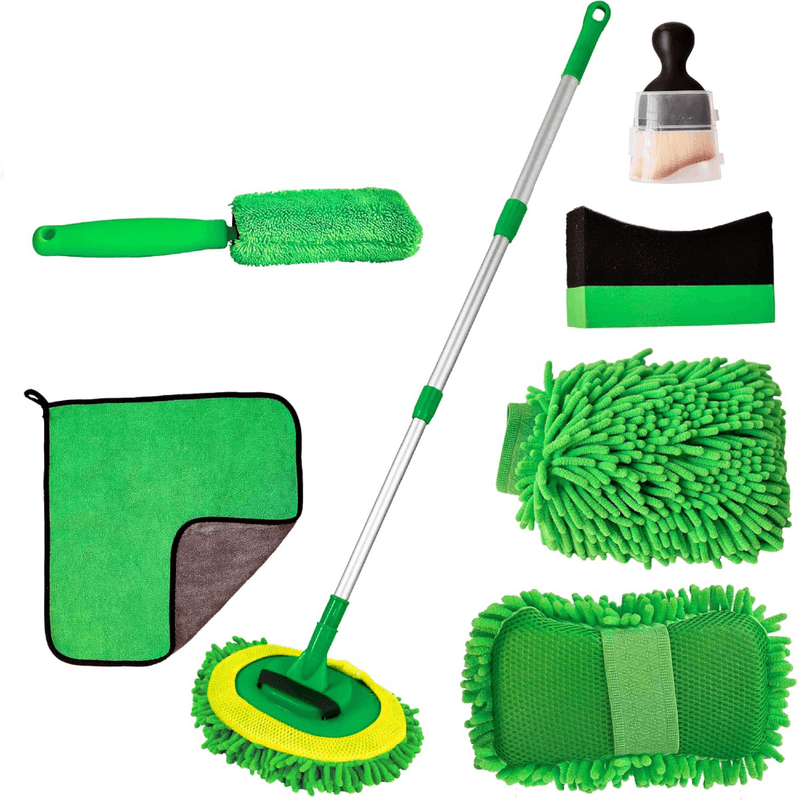 El cepillo para rueda con mango largo con cabezal de microfibra duradero llega detrás de las llantas para eliminar el polvo de los frenos y la suciedad de la carretera. Junto con la esponja EVA en forma de U, ofrece una limpieza completa de las ruedas