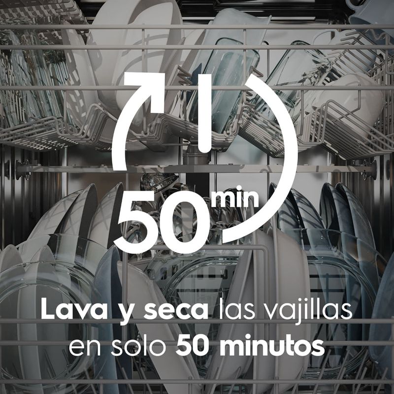Con el programa Lava & Seca 50', tus platos estarán limpios y secos en solo 50 minutos, ideal para utensilios poco sucios que requieren una limpieza rápida y eficaz. Además, el Programa Eco 8 Cubiertos logra un lavado perfecto mientras ahorras hasta un 44% de energía² y un 88% de agua, cuidando tanto de tus platos como del medio ambiente2.