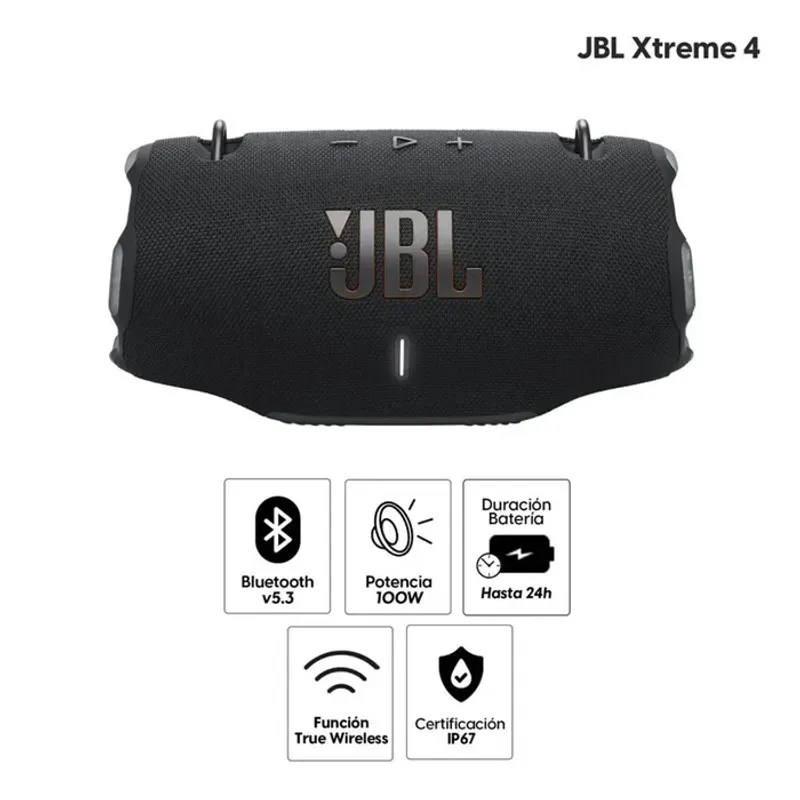 Potencia y Calidad de Sonido: El parlante Bluetooth JBL Xtreme 4 es una opción destacada para quienes buscan una experiencia de audio potente y envolvente. Con una impresionante potencia de 100W, este dispositivo garantiza un sonido claro y robusto, capaz de llenar cualquier espacio con música de alta calidad. Su rendimiento superior lo convierte en una elección ideal tanto para eventos al aire libre como para reuniones en interiores. Durabilidad y Resistencia: Diseñado para resistir las condiciones más exigentes, el JBL Xtreme 4 cuenta con una certificación de resistencia al agua IP67. Esto significa que es completamente a prueba de polvo y puede soportar inmersiones en agua, lo que lo hace perfecto para usar en la playa, la piscina o durante actividades bajo la lluvia. Su construcción robusta asegura que puedas disfrutar de tu música sin preocupaciones, independientemente del entorno.