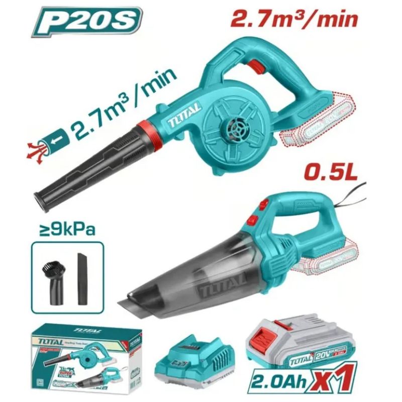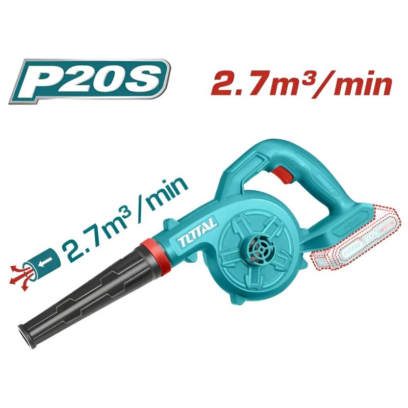 Sistema de Baterías P20S: El beneficio "Mega" de este combo es que incluye dos baterías que son compatibles con más de 150 herramientas de la marca TOTAL. Mientras usas una en la sopladora, puedes cargar la otra o usarla en tu taladro o sierra.