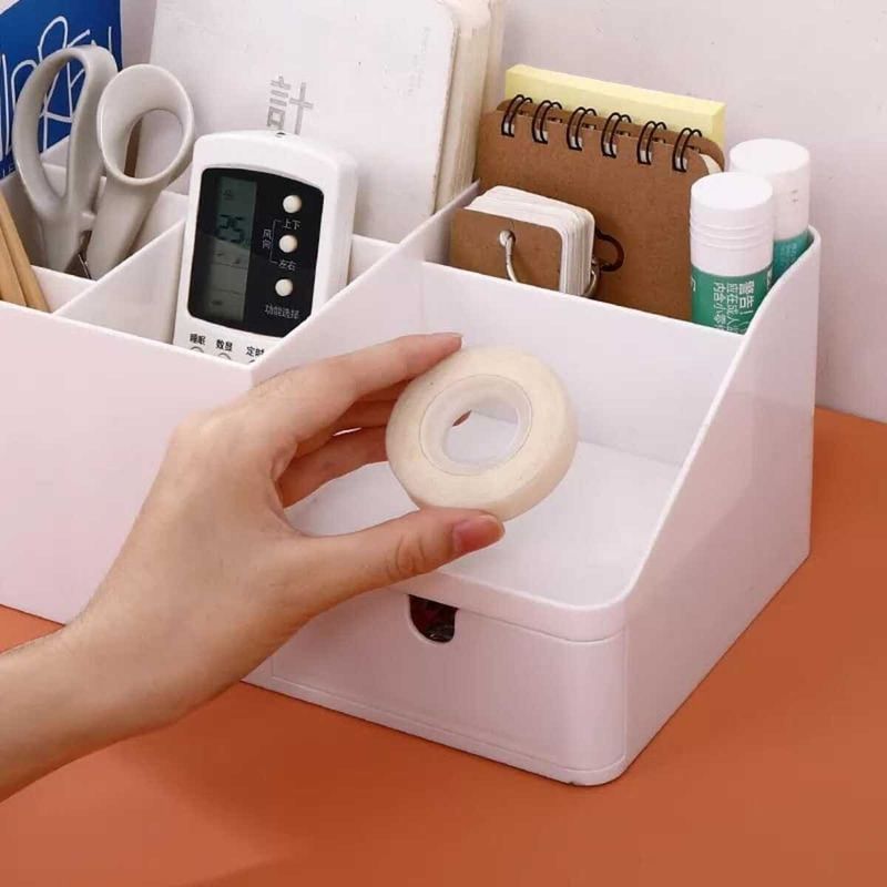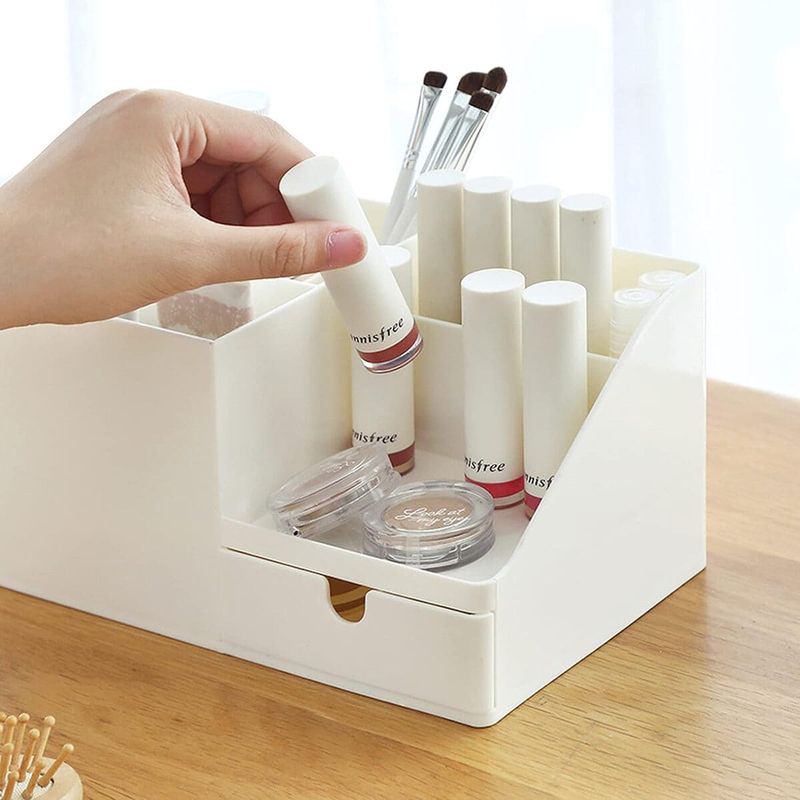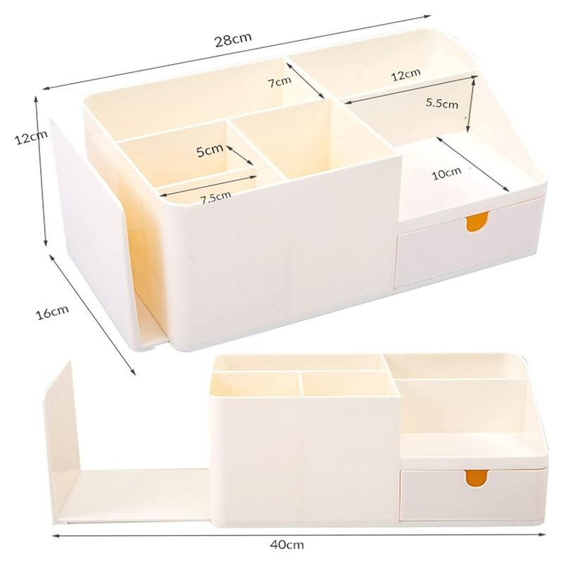 Este organizador multiuso es una solución práctica para llevar el orden en su escritorio, baño y cosméticos. Cuenta con divisiones para clasificar mejor sus útiles de uso diario y puede extenderse para colocar libros o toallas pequeñas.