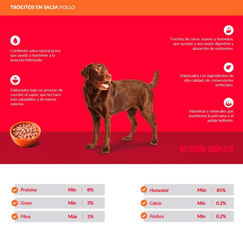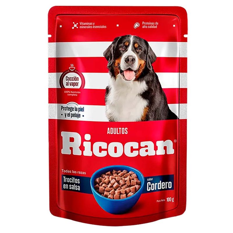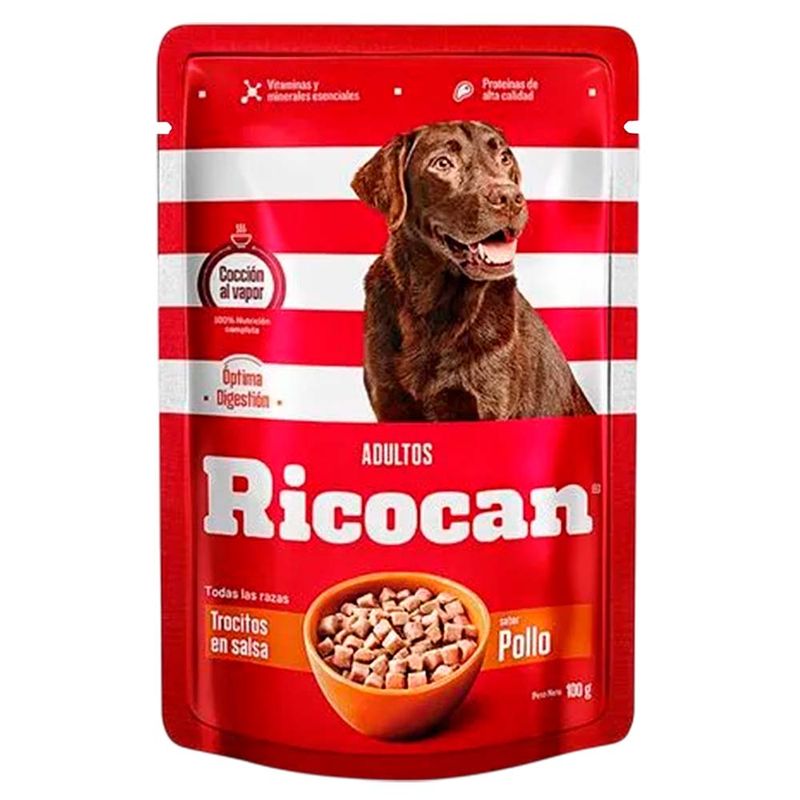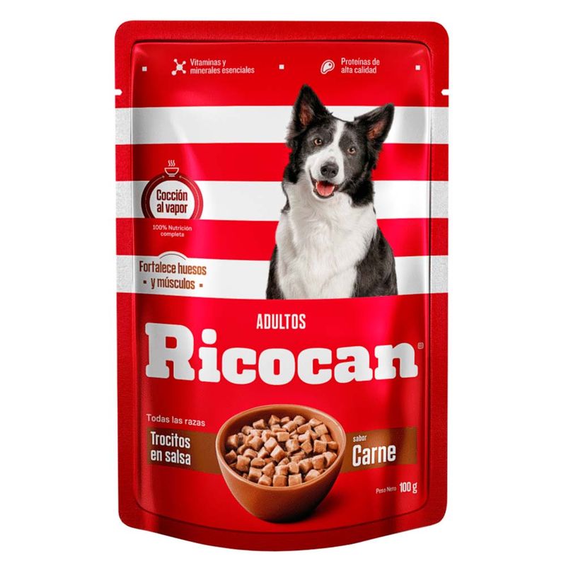 Ricocan pouch adultos trocitos en salsa gravy es un alimento húmedo premium, 100% completo y balanceado, que complementa la nutrición de la mascota. Además, la mantiene siempre hidratada gracias a su alto porcentaje de humedad.