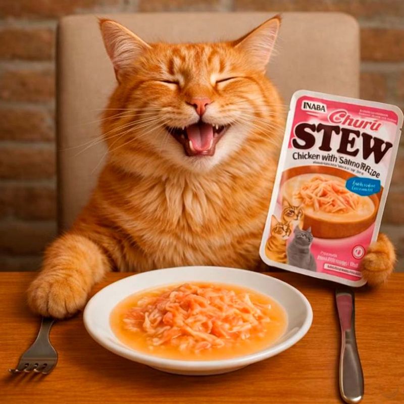 Churu Stew de Pollo y Salmón es un snack premium con una textura de guiso tradicional, que combina un caldo suculento con hebras de pollo desmigado y salmón del Pacífico. Con un 86% de humedad y solo 18.8 calorías, es el complemento ideal para gatos que aman las texturas con trozos reales. Enriquecido con Vitamina E y Té Verde, apoya la inmunidad y el brillo del pelaje. Sin cereales ni conservantes.