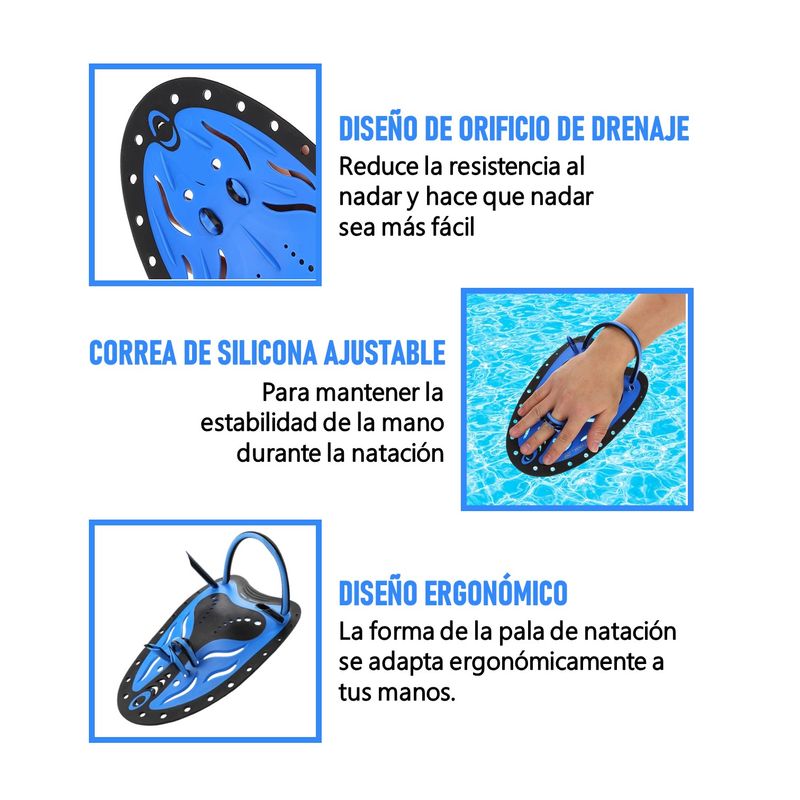 Las paletas de natación deben ser entre 1 y 2 cm más grandes que la mano para mejorar la técnica y aumentar la fuerza, generalmente clasificadas en tallas chica (técnica/iniciación), mediana (versátil) y grande (avanzados/fuerza). Se usan con ligas en el dedo medio y mano, siendo ideales para el entrenamiento superior.