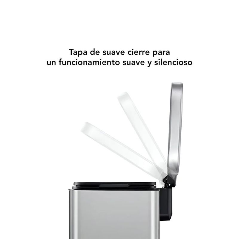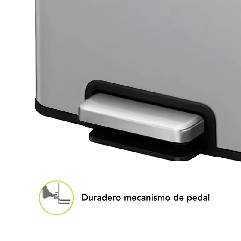 Su sistema de apertura mediante pedal ofrece una experiencia de uso higiénica y práctica, evitando el contacto directo con la tapa. El pedal está diseñado para soportar un uso frecuente y continuo sin comprometer su funcionalidad. Además, la estructura de acero inoxidable no solo le proporciona un acabado elegante en color plateado, sino que también es muy fácil de limpiar, manteniendo su brillo y apariencia con el mínimo esfuerzo.