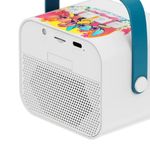 Uno de sus grandes diferenciales es su función karaoke, ideal para reuniones, fiestas o momentos de diversión en familia. Incluye un micrófono inalámbrico con eco integrado y cinco efectos de cambio de voz, lo que permite personalizar cada interpretación y disfrutar de una experiencia interactiva y entretenida. Su potencia de salida de 5W ofrece un sonido claro y balanceado, adecuado para espacios pequeños y medianos.