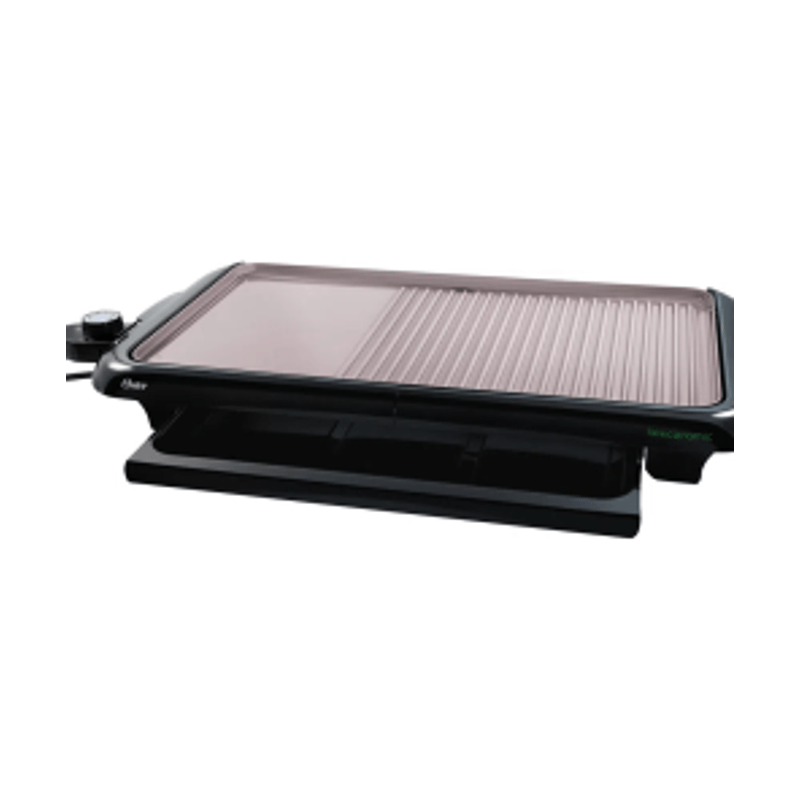 Parrilla y pancha Oster CKSTGR5085-053,Sistema dual 2 en 1 (parrilla y plancha) que permite preparar una amplia variedad de alimentos al mismo tiempo. Su superficie tiene un recubrimiento de Bioceramic, lo que evita que los alimentos se peguen, y la gaveta térmica mantiene la comida tibia mientras terminas de cocinar.