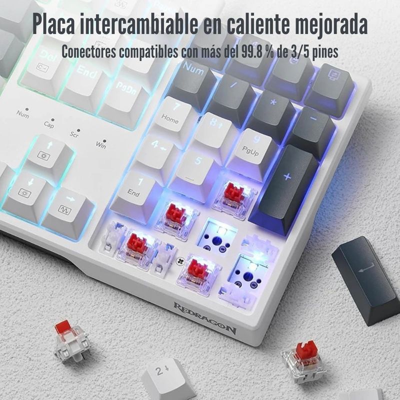 El Redragon Trundle K668WBO es un teclado mecánico de tamaño completo diseñado para jugadores y usuarios que buscan personalización y rendimiento, destacando por su capacidad hot-swappable que permite cambiar los interruptores sin soldar, su retroiluminación RGB personalizable para efectos visuales atractivos, y su diseño ergonómico con funciones anti-ghosting para una experiencia de escritura y juego fluida, generalmente equipado con interruptores lineales (red switches) que ofrecen una respuesta suave y silenciosa.