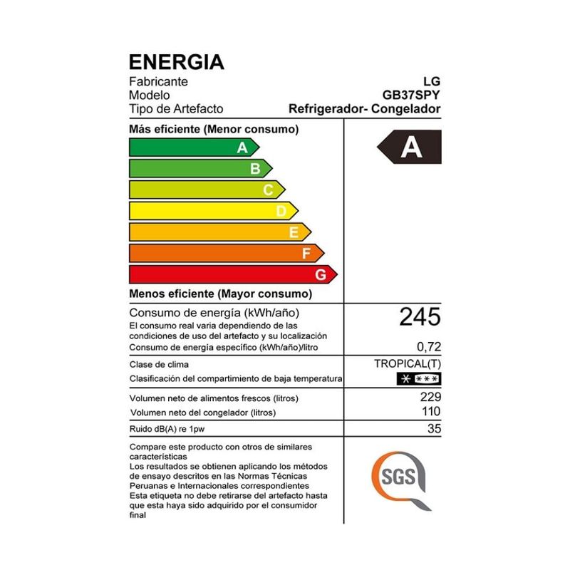 ElectrohogarRefrigeracionRefrigeradorasRefrigeradora Lg Gb37spy Bottom Freezer 339 litros