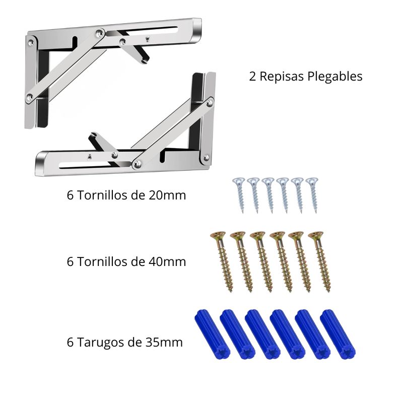 soportes plegables, 6 tornillos de 20mm, 6 tornillos de 35mm y 6 tarugos de