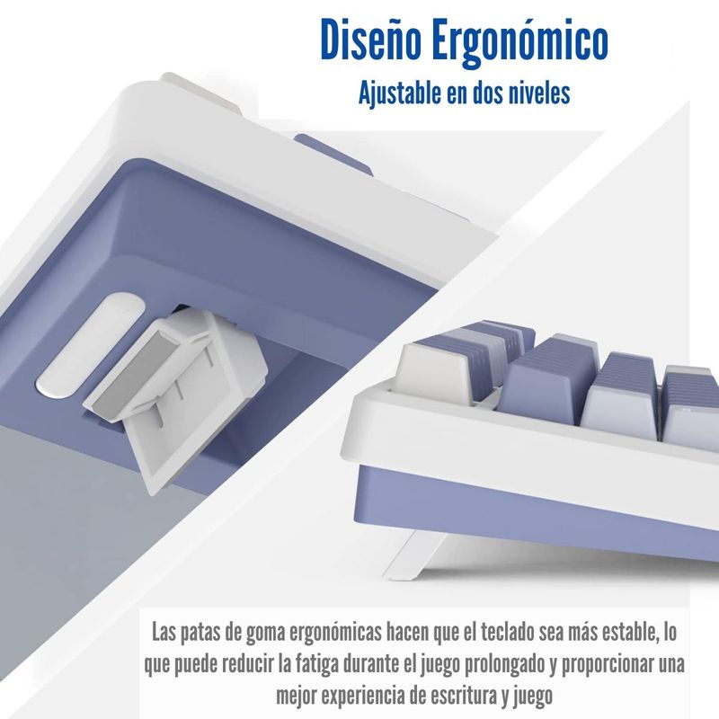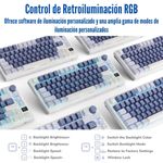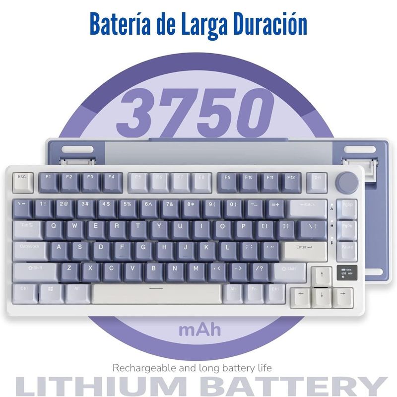 El Royal Kludge M75 Wireless Ocean Blue es un teclado mecánico 75% compacto, con conectividad tri-modo (USB-C, Bluetooth 5.1 y 2.4 GHz inalámbrico), iluminación RGB personalizable, pantalla OLED con perilla para ajustes rápidos y una batería de 3750 mAh, que ofrece hasta 100 horas de autonomía. Sus switches K Silver brindan una respuesta rápida y fluida, ideales para gaming y escritura, mientras que su diseño Ocean Blue le da un toque estético distintivo.