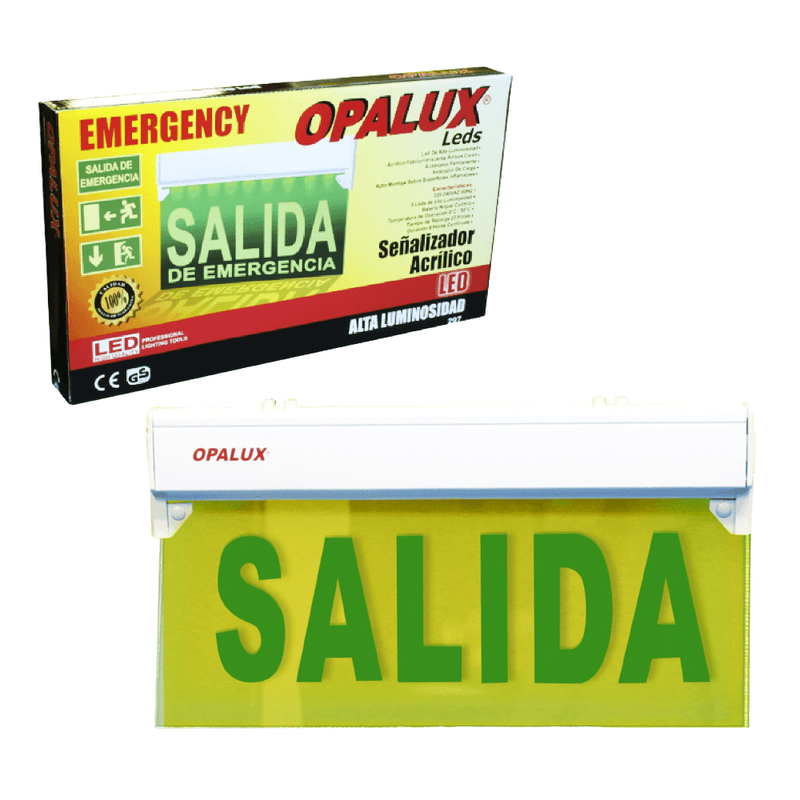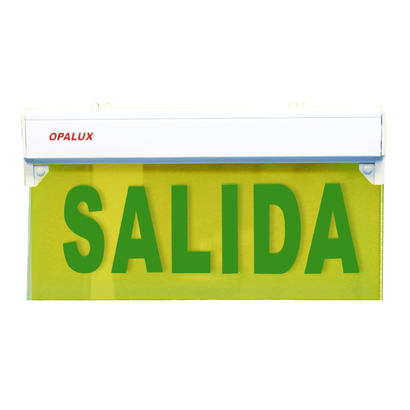 Señal LED de emergencia “SALIDA” tipo acrílico Opalux OP-297GR-S, con iluminación permanente mediante 16 LED. Tiene autonomía de 90 minutos con batería de respaldo, montaje en techo, pared o bandera, frente fotoluminiscente a doble cara. Ideal para rutas de evacuación en edificios.