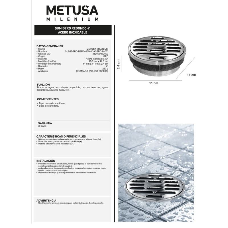 Construccion y herramientasGasfiteriaAccesorios Sanitarios y de GasfiteriaSumidero Redondo Ultrainox 4" Acero Inoxidable Pulido Metusa