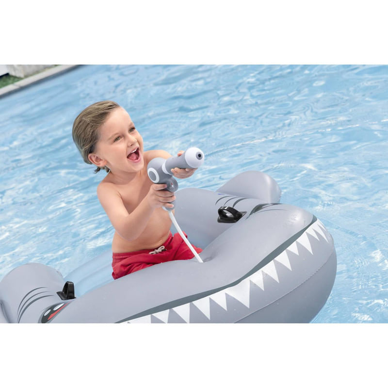 Características: Con forma de tiburón y gráficos, a los niños de 3 años en adelante les encantará patear, chapotear y usar la pistola de agua incorporada que cabe en la parte delantera de la tabla de natación. La pistola de agua extrae agua desde abajo, lo que permite a los niños lanzar agua a sus amigos mientras chapotean y juegan. La tabla de natación Sharkventure cuenta con una almohadilla hinchable en el interior para mayor comodidad y dos asas resistentes para que los niños se agarren.