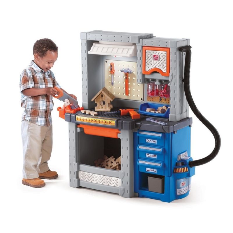 Equipado con un gabinete que simula una caja de herramientas, un cajón deslizante, contenedores para piezas, frascos colgantes y una aspiradora de juguete, proporcionando múltiples opciones de almacenamiento y organización.