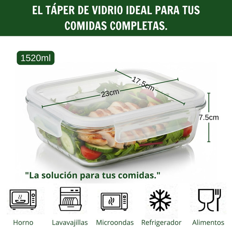 Táper de Vidrio Hermético Rectangular 1520 ml: Practicidad y Elegancia para tus Comidas