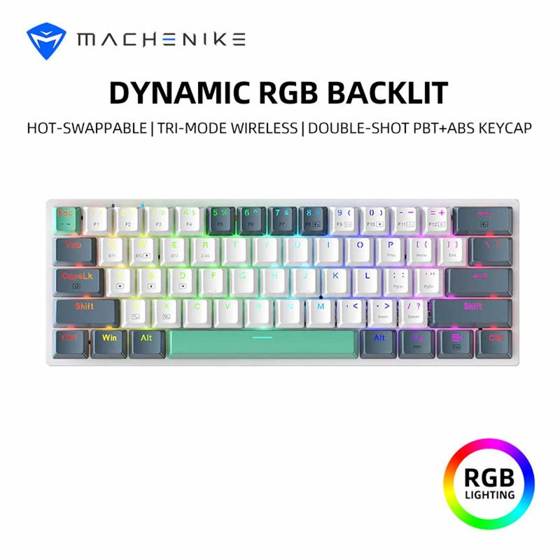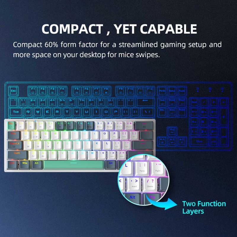 Teclado para juegos 60% pequeño: este teclado inalámbrico compacto para juegos de 61 teclas sin un numpad garantiza la eficiencia del espacio del escritorio. A pesar de su pequeña construcción, incluye teclas de flecha separadas y teclas multimedia F1-F12, características esenciales para un teclado inalámbrico destinado a juegos de PC.