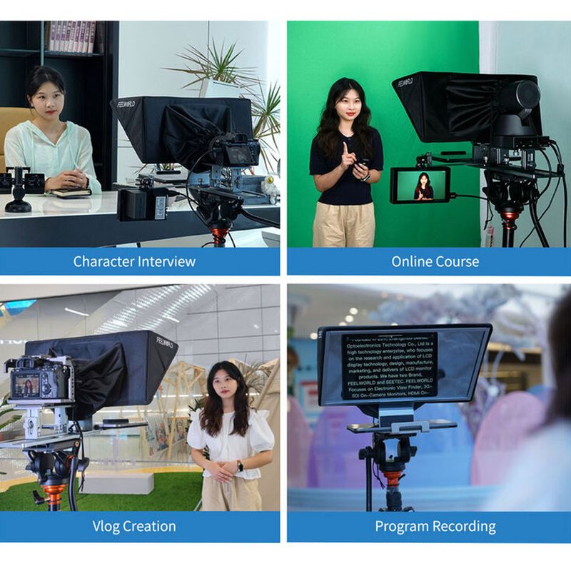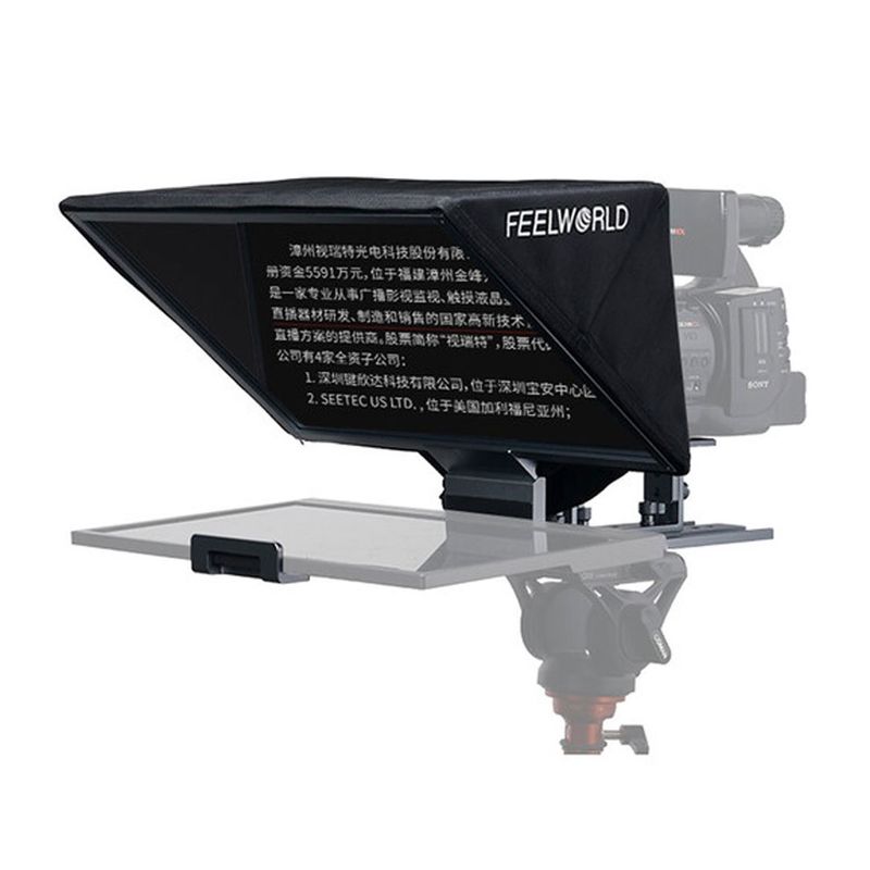 Graba contenido con guion con tu cámara, videocámara o PTZ con este teleprompter plegable FeelWorld TP16 para tu próxima transmisión en vivo, presentación o entrevista. Convierte tu tableta en tu teleprompter con la abrazadera incluida, compatible con dispositivos de hasta 16". El cristal divisor de haz 70/30 se encuentra en un ángulo de 135° para máxima visibilidad y el parasol con cordón incluido admite objetivos gran angular de 24 mm o más. Los tornillos de 1/4" fijan el dispositivo de grabación que prefieras al marco de aluminio, tanto en orientación horizontal como vertical.