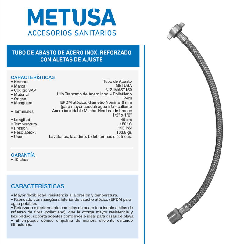 Tubo de Abasto para Lavatorio 1/2"x40cm Acero Inoxidable Metusa. Disfruta de lo más nuevo que Promart.pe trae para ti.
