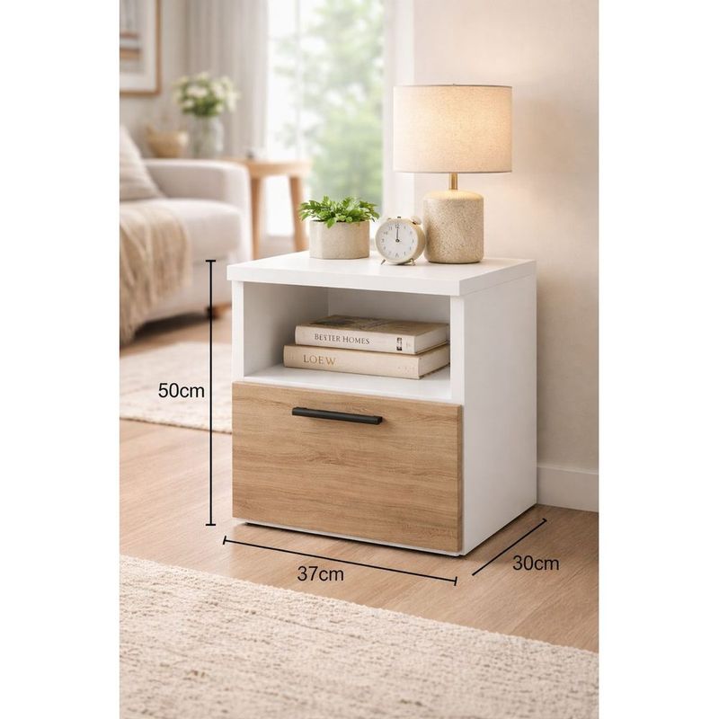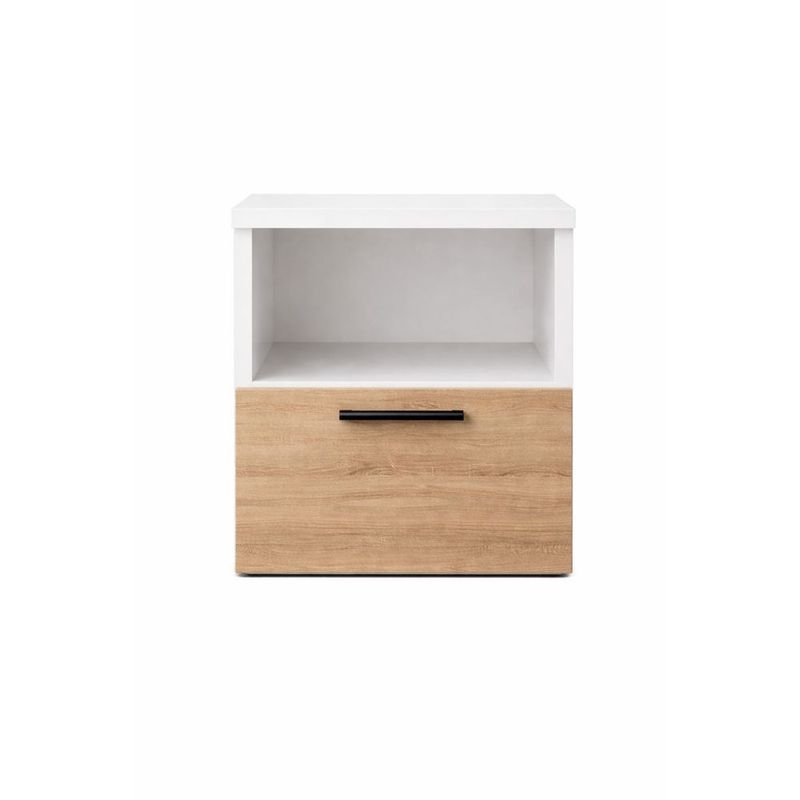Aporta orden y funcionalidad a tu dormitorio con este velador de diseño moderno y líneas limpias. Fabricado en melamina Pelikano de 18 mm en color Lino Fantasía, cuenta con un cajón inferior y un nicho abierto para mantener tus objetos esenciales siempre a la mano. excelente para dormitorios contemporáneos que buscan practicidad sin perder estilo.