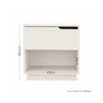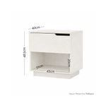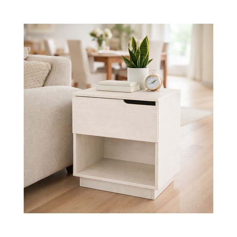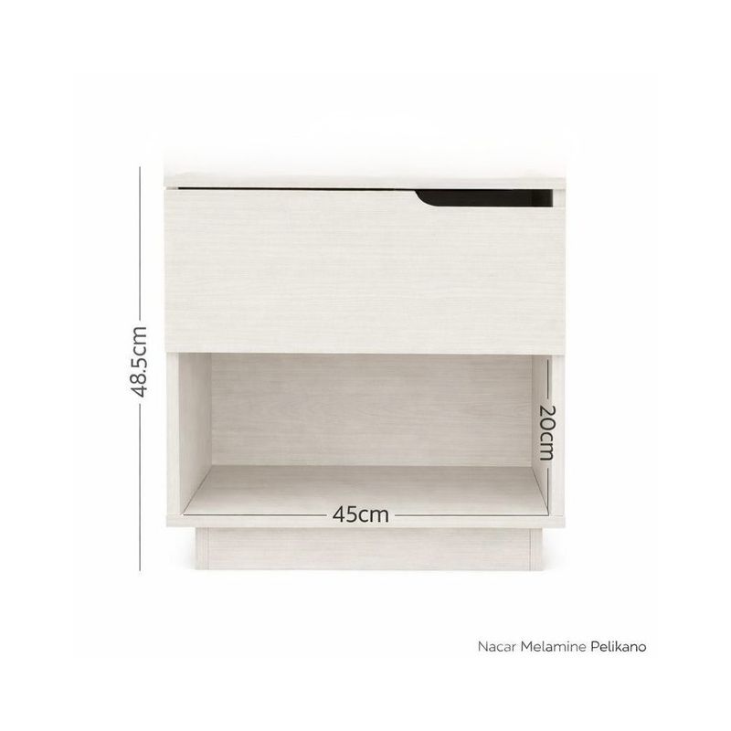 Velador moderno en melamina Pelikano color Lino Fantasía, con un diseño limpio y funcional. Cuenta con un cajón superior con uñero integrado y un nicho abierto inferior para libros u objetos decorativos. Aporta calidez y practicidad a dormitorios modernos o espacios pequeños.
