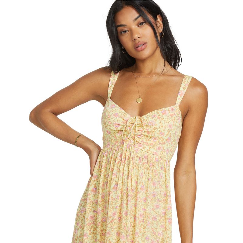 Vestido Para Mujer So Dreamy Amarillo Billabong.El vestido para mujer So Dreamy forma parte de la colección Tropical High, cuenta con un escote corte de corazón y un lazo frontal.