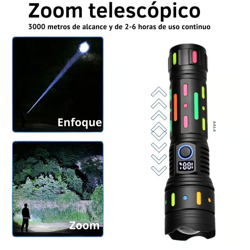 Equipado con un láser blanco, proporciona precisión y señalización en situaciones críticas. Además, el zoom ajustable te permite adaptar el haz de luz a tus necesidades, ya sea para iluminar grandes áreas o concentrar la luz en un punto específico. Sus 5 modos de luz (fuerte, media, baja, estroboscópica y SOS) ofrecen opciones para todo tipo de situaciones, asegurando una solución para cada momento.