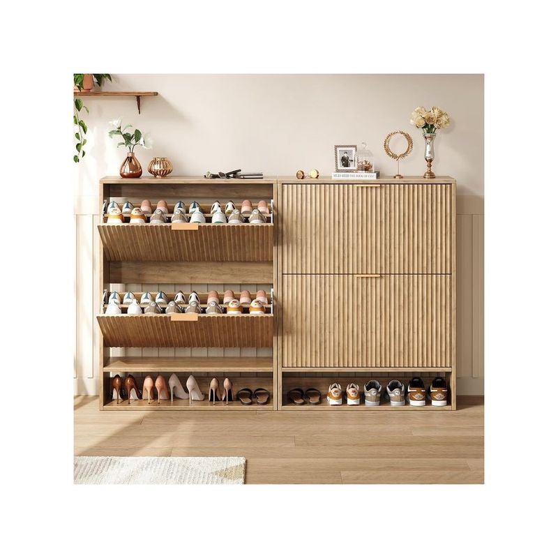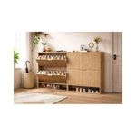 Zapatero de diseño moderno y elegante fabricado en MDF estructural, con frentes ranurados que aportan textura y carácter visual. Integra un módulo de zapatera abatible para una organización eficiente del calzado y un módulo lateral con puertas para almacenamiento adicional. Su acabado en madera natural y su diseño equilibrado lo convierten en una pieza funcional y decorativa, excelente para recibidores, dormitorios o espacios sociales.