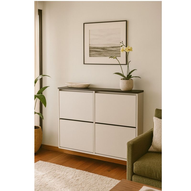 Fabricada en elegante melamina color Capri, combinada con un tablero superior en tono Fumé, aporta un look sobrio, sofisticado y totalmente contemporáneo. Sus 4 puertas abatibles permiten almacenar calzado de manera ordenada y discreta, manteniendo la estética limpia del ambiente.